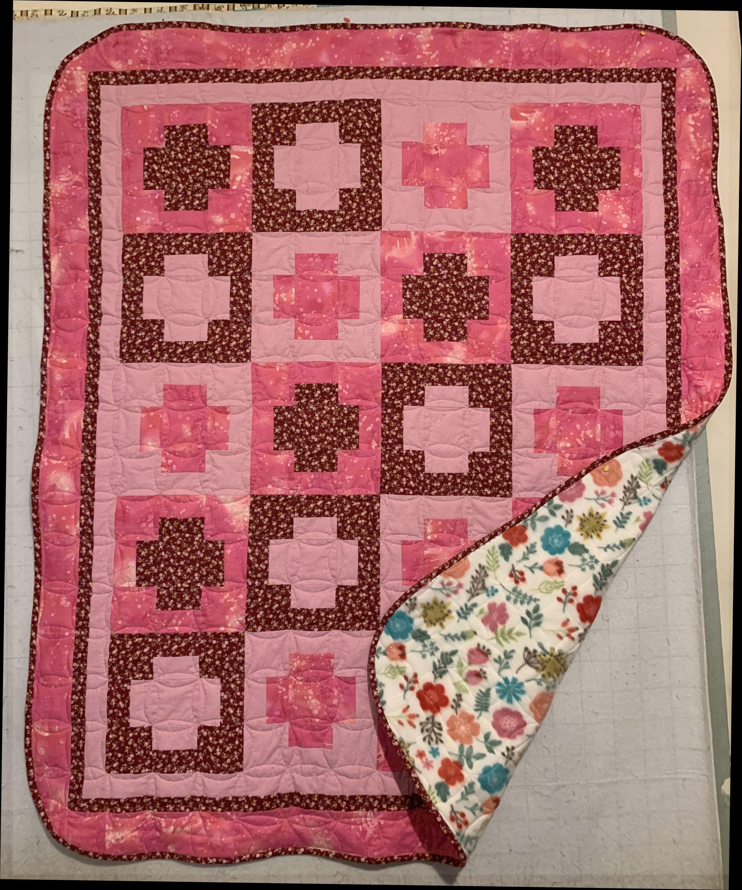 After fussing with the scrappy version, I wanted to see how quick the project would be using only 3 fabrics. Yep, lots quicker of course. This one finished at 46 x 55. I quilted with a pink shade of Glide thread doing a freehand orange peel allover. The backing is a pretty flower print fleece. The kiddos love to cuddle under the fleece.